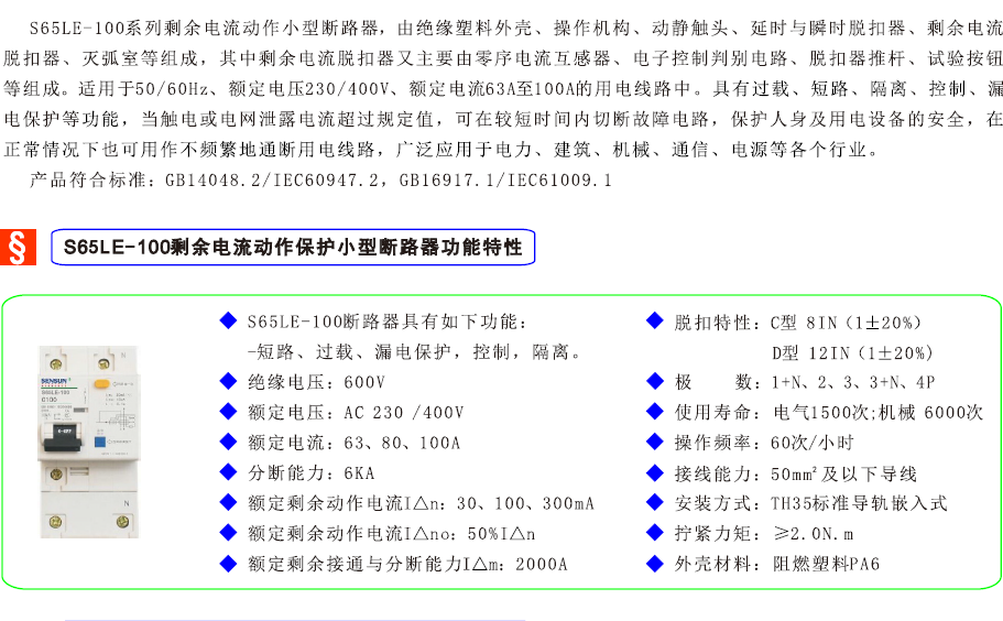 S65LE-100系列剩余电流动作保护小型断路器
